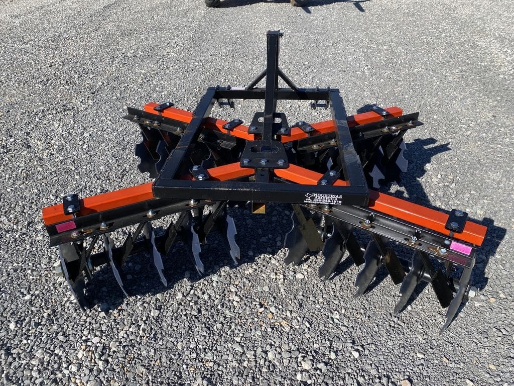 The Industrias America 1820X 3PT Tandem Disk is designed to provide consistent soil preparation and effective residue management. Its tandem disk design ensures even coverage, smooth soil incorporation, and improved field leveling for planting operations.This implement is built with a heavy-duty steel frame and durable disk blades that can handle various soil conditions, including clay, loam, and sandy soils. The 3-point hitch design allows for easy attachment to standard tractors while providing stability and control in the field.Maintenance is straightforward, thanks to sealed bearings and accessible service points. This ensures minimal downtime and reliable performance season after season, making it ideal for both small-scale and large-scale farming operations.